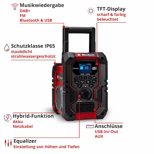 Das Einhell Akku-Radio TE-CR 18 DAB+/FM/BT überzeugt als vielseitiges und robustes akku-baustellenradio mit Hybrid-Betrieb, DAB+/FM-Empfang, Bluetooth, USB und X-Change-Kompatibilität. Dank IP65-Schutz, stoßfestem Gehäuse und intuitiver Bedienung eignet sich das Radio für anspruchsvolle Umgebungen wie Baustelle, Garten oder Haushalt. Die flexible Konnektivität, individuelle Klanggestaltung und praktische Zusatzfunktionen wie Wecker und USB-Ladefunktion bieten Komfort und Effizienz im Alltag. Damit adressiert das Einhell Akku-Radio TE-CR 18 DAB+/FM/BT gezielt die Anforderungen moderner Nutzerinnen und Nutzer, die Wert auf Mobilität, Langlebigkeit und einfache Integration in bestehende Techniklandschaften legen.